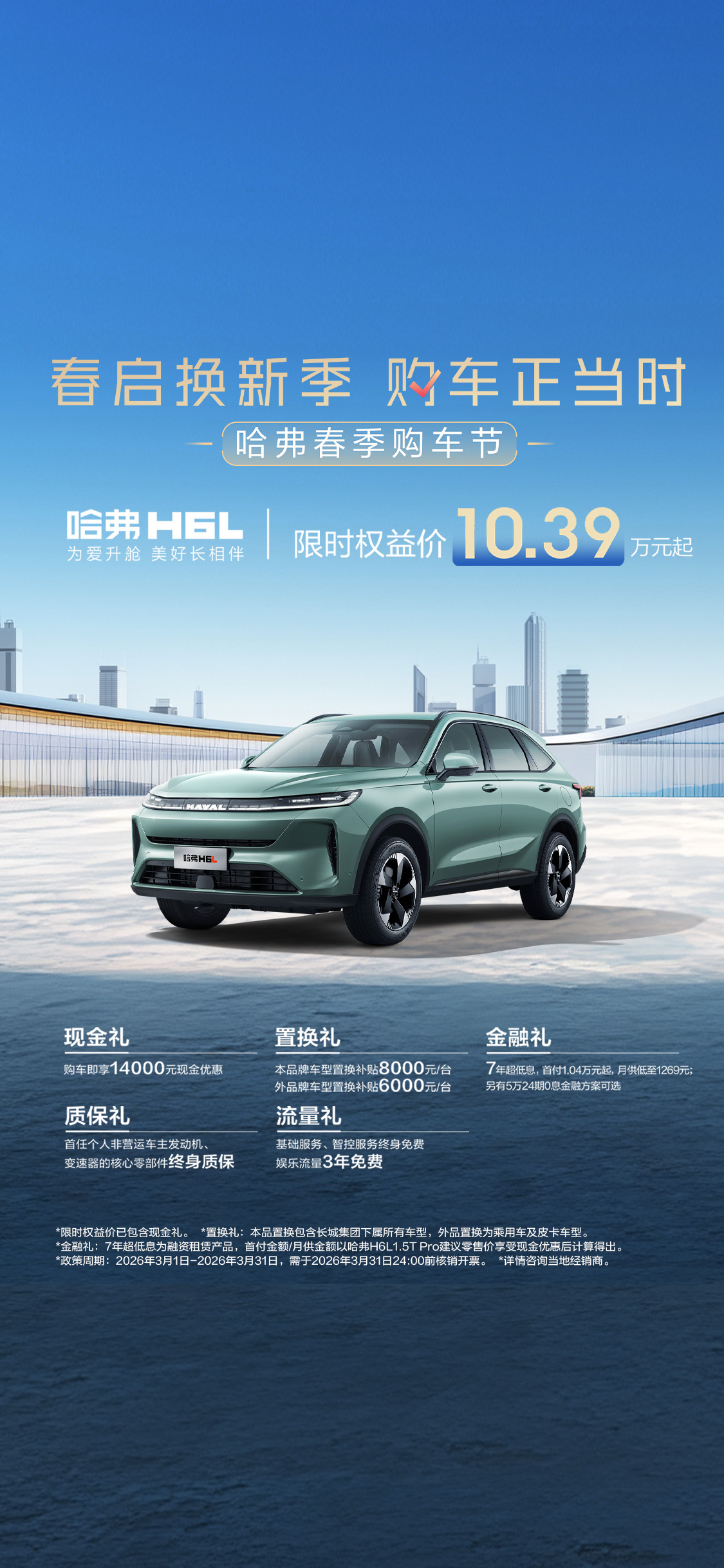 ③ 金融礼:7年超低息为融资租赁产品,首付金额/月供金额以利发国际H6L 1.5T Pro建议零售价享受现金优惠后计算得出。